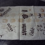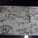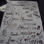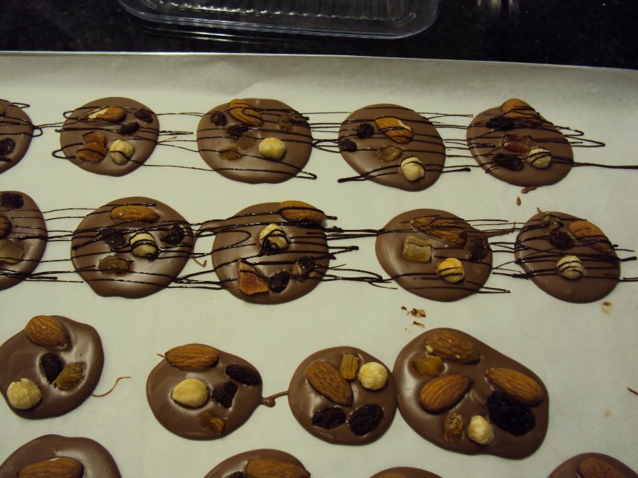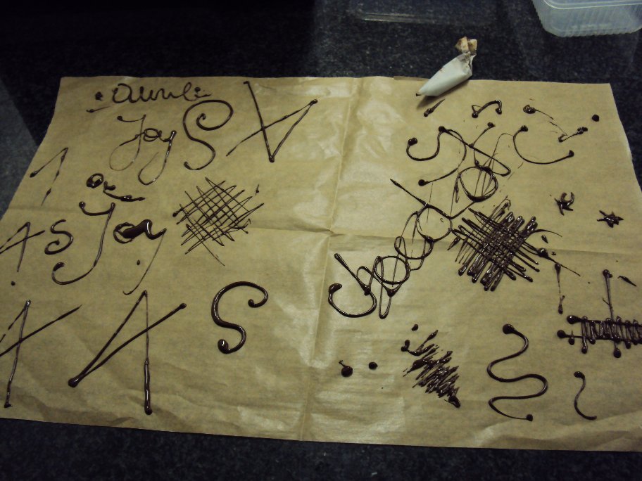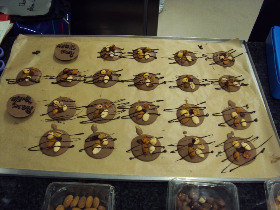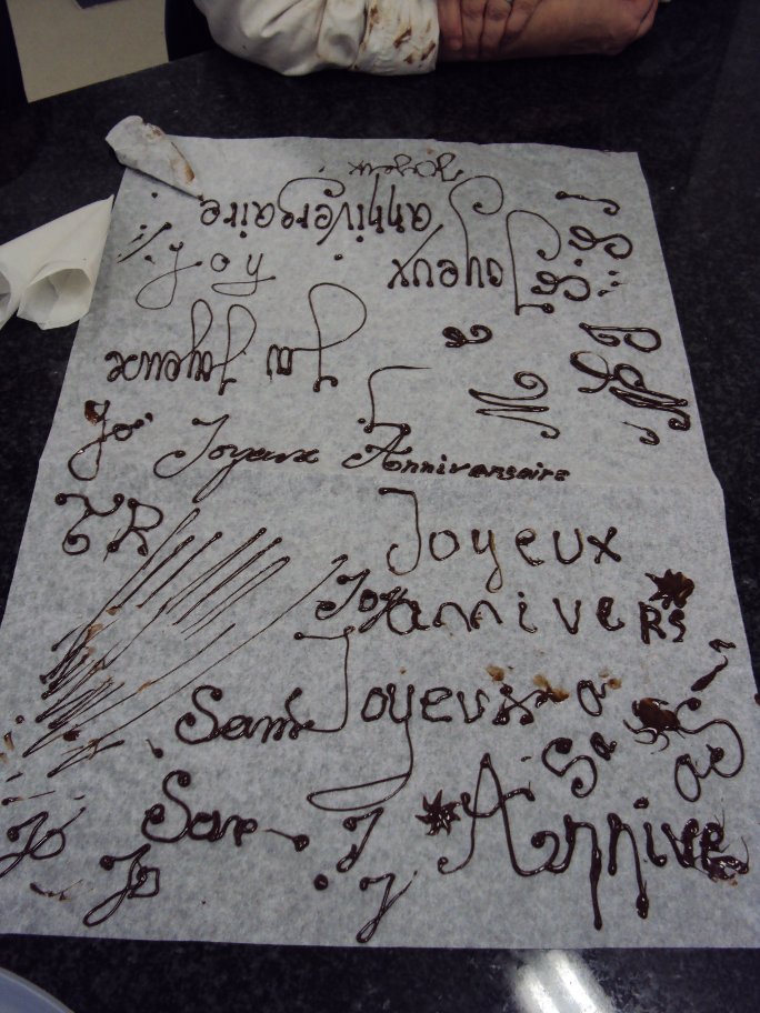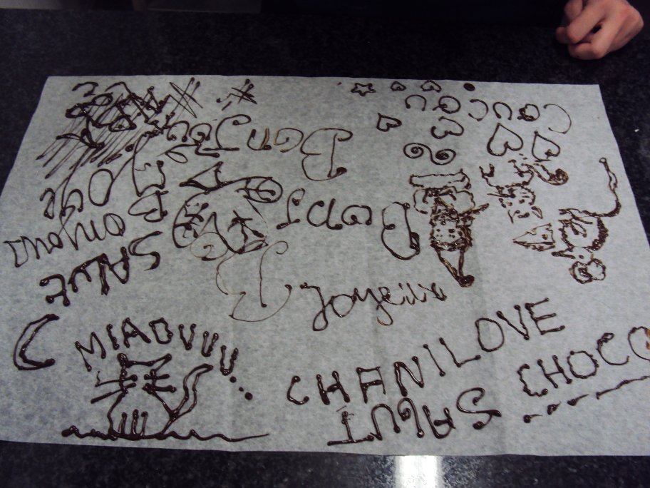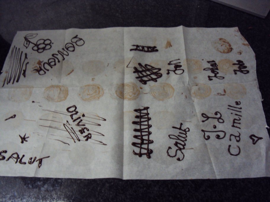 Après la réalisation des mendiants avec chocolat noir & chocolat au lait, notre professeur nous a montré la technique d’écriture au cornet ! Voici les oeuvres de mes compagnons chocolatiers !