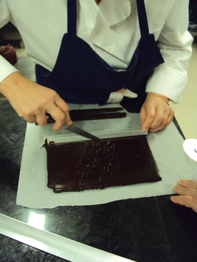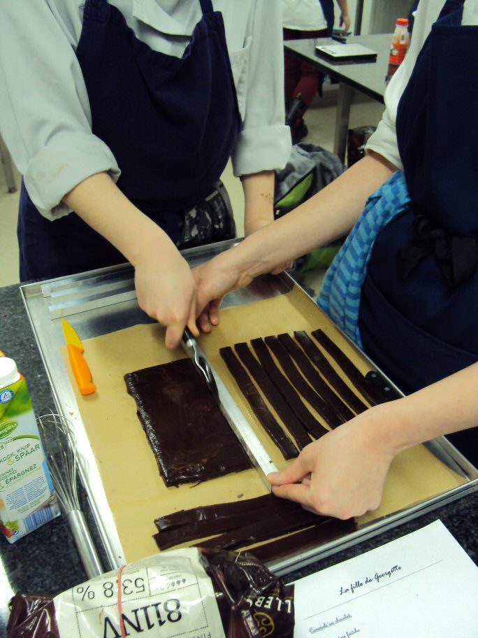 - Redescendre la température et ajouter le miel puis le beurre et le chocolat en callets toujours en remuant pour éviter que l’appareil colle dans la casserole.