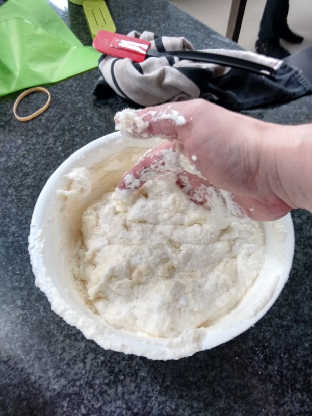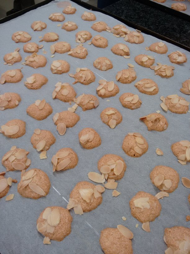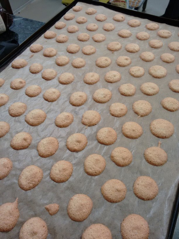 La quantité de sucre est juste une question de goût. J’ai fait un mix entre sucre semoule et sucre vanillée. Quand vous ajoutez le broyage dans les blancs, utilisez votre main délicatement de l’intérieur du bol vers l’extérieur. Faite le mouvement lentement et ajoutez le mélange en trois fois. C’est pas nécessaire d’avoir un mélange homogène, il peut rester des morceaux de blancs. L’appareil doit être « tremblotant ». Ne pas « casser » les blancs. Pochez l’appareil et couler sur plaque. Normalement il faut laisser sécher une ou deux nuits parce que les blancs apportent beaucoup d’humidité. Vous pouvez aussi mettre des amandes effilées en décoration avant la cuisson. Fourrez avec la ganache ou une crème au beurre.