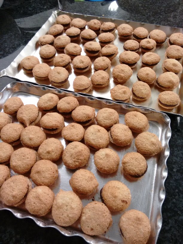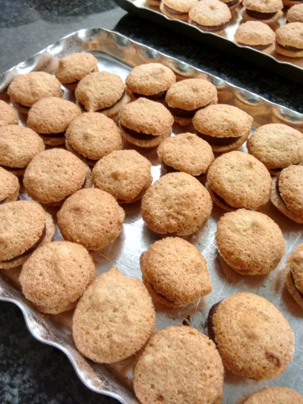 - Laissez refroidir, retournez la moitié de ceux-ci et fourrez-les de ganache légèrement durcie.